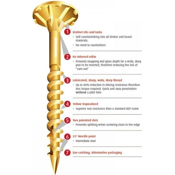 The most recent iteration of technological brilliance is represented by countersunk wood screws. They have a unique design that provides the best performance and finish in all wood applications. The screw can operate closer to the edge without splitting thanks to the two innovative slots (25 mm and above), and the ribs and tucks under the head allow the screw to sit flush and tightly without causing surface damage. Without drilling a pilot hole, needle points can almost always pierce wood, and their sharp, deep threads have a distinct lubricant. The deep reinforced countersunk head break allows for the best fit to the driver bit, reducing cam out and adding extra strength at the crucial intersection of the shank and head, while the yellow tropicalized coating provides good corrosion resistance.